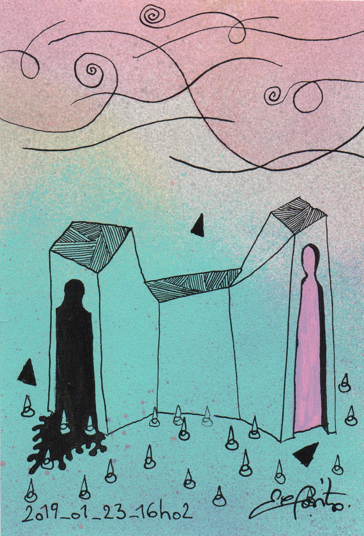 Matthieu Exposito, artiste peintre, artiste plasticien, clous, expressionnisme, figuration libre, boites vides, vide, Escher, Penrose, origine, expressionnisme, non-violence, LOVE, peace, grille de composition, art brut, naturalisme, la tour de Babel, inefficacité des mouvements sociaux, figuration libre, médiocratie, victor Hugo, chat de schrodinger, zola, tolstoï, william ladd, original drawing, artwork, Indiana ink