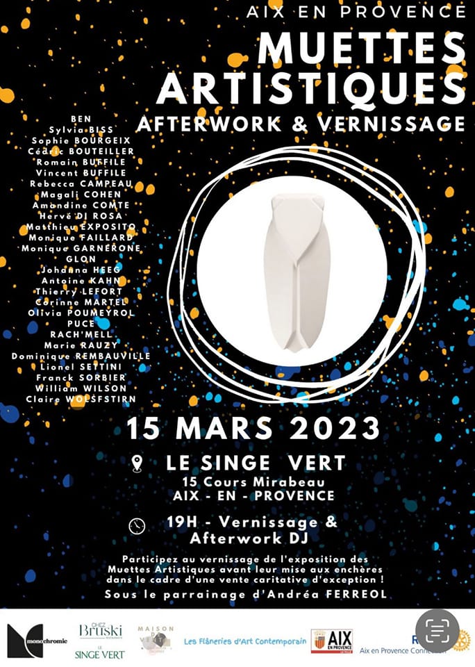 Retrouvez les toutes le 15 mars au Singe Vert à Aix-en-provence lors du vernissage de l’exposition des Muettes Artistiques avant leur mise aux enchères dans le cadre d’une vente caritative d’exception ! Sous le parrainage d’Andréa FERREOL.